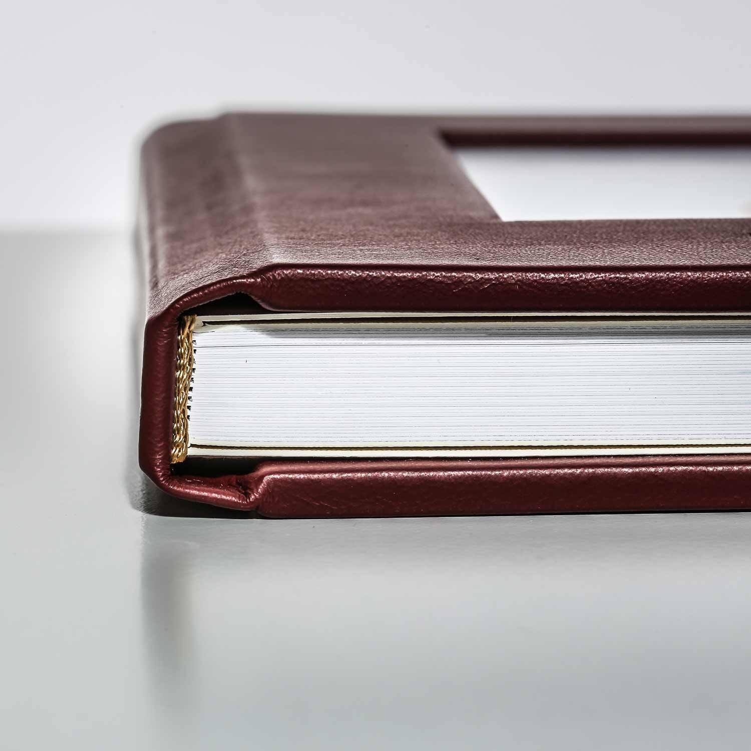 Windows automatically direct the gaze towards a particular section of an image requiring highlighting. To give you more design flexibility, we offer three window formats for you to play with. The classic square window in the centre of the cover and windows in portrait or landscape format positioned at the edge. The size of the windows increases with the size of the album. The advantage of this custom feature is that the cover image is processed behind a layer of material; edges are concealed and protected.