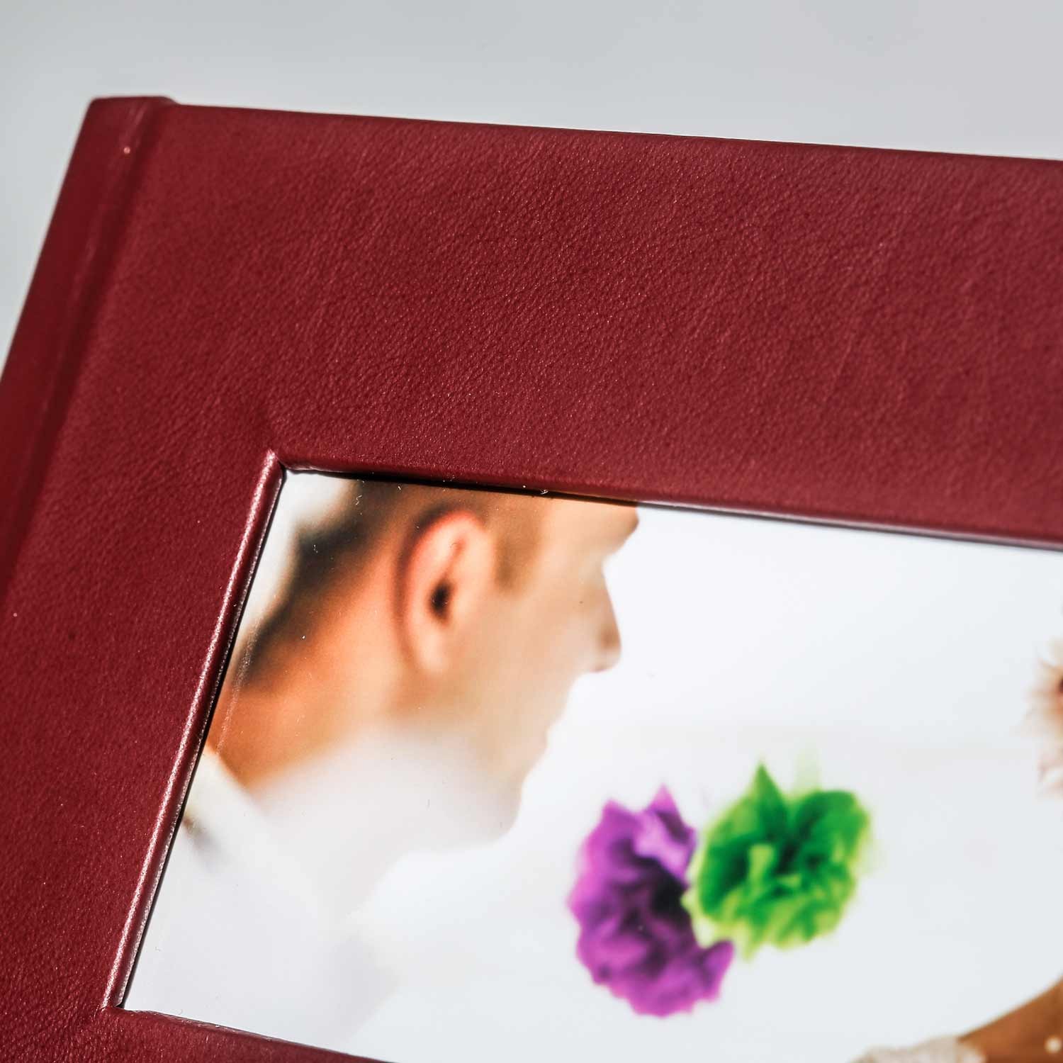 Windows automatically direct the gaze towards a particular section of an image requiring highlighting. To give you more design flexibility, we offer three window formats for you to play with. The classic square window in the centre of the cover and windows in portrait or landscape format positioned at the edge. The size of the windows increases with the size of the album. The advantage of this custom feature is that the cover image is processed behind a layer of material; edges are concealed and protected.
